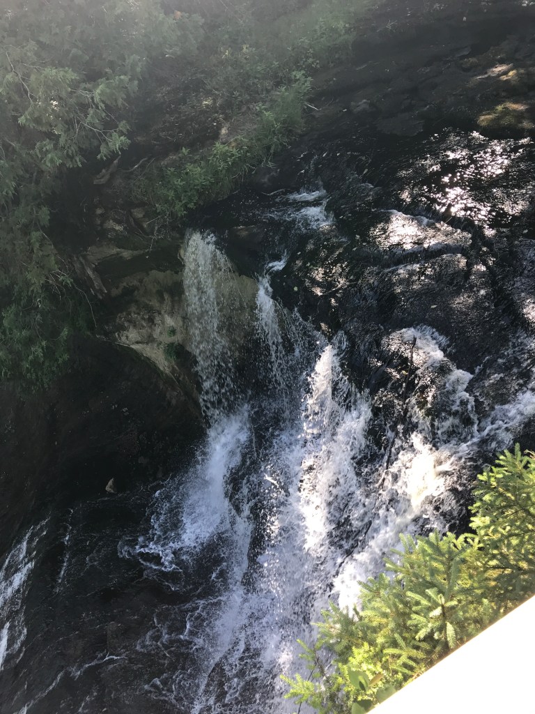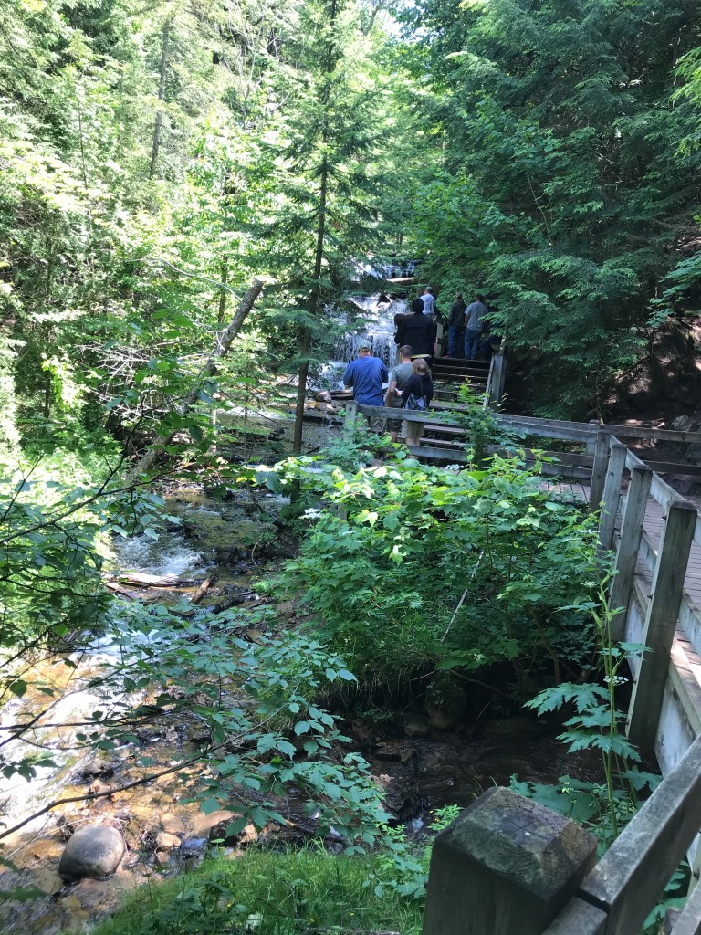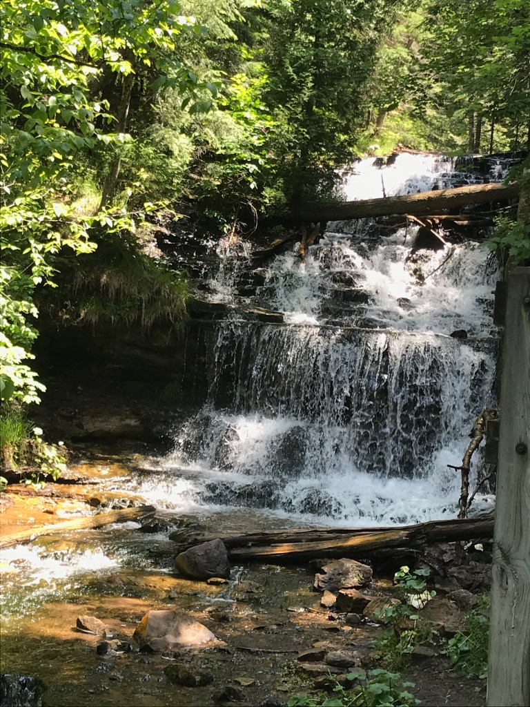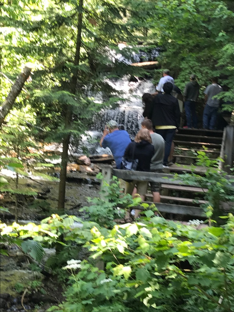 We started in the morning heading north. I had visions of seeing many waterfalls, but ended up seeing three. Still, they were a joy to see. First stop, “Laughing Whitefish Falls”, this had a short walk in and then 152 steps down to the bottom. (Leonard counted. 🙂 After this one, he decided that he didn’t want to go to anymore that you had to walk to.