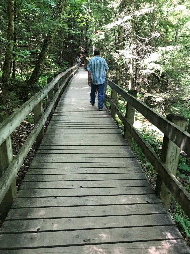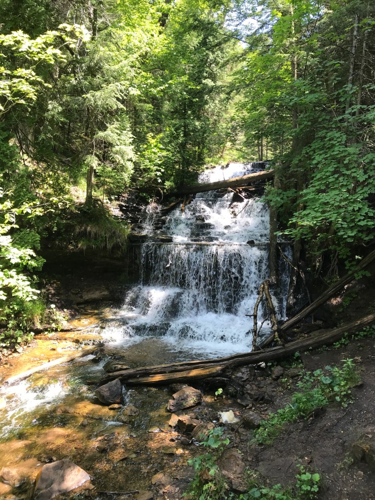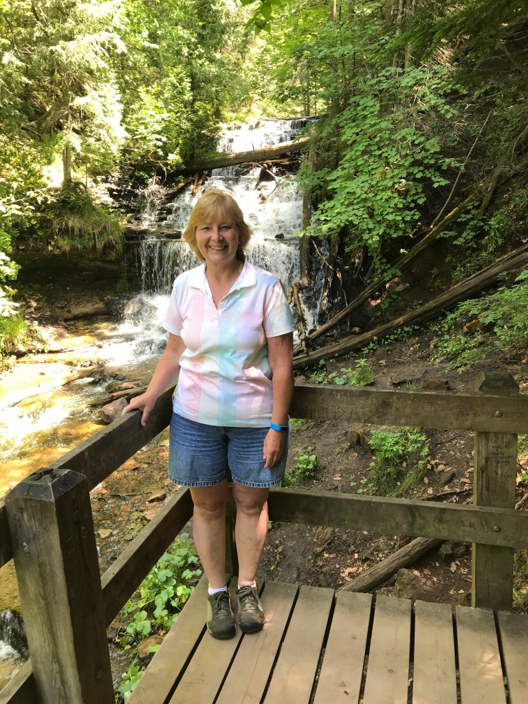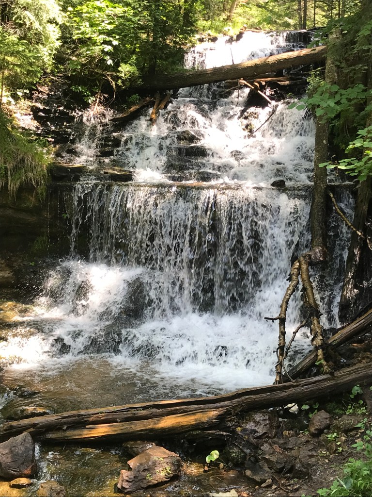 We started in the morning heading north. I had visions of seeing many waterfalls, but ended up seeing three. Still, they were a joy to see. First stop, “Laughing Whitefish Falls”, this had a short walk in and then 152 steps down to the bottom. (Leonard counted. 🙂 After this one, he decided that he didn’t want to go to anymore that you had to walk to.