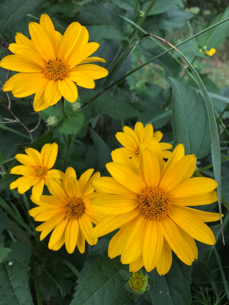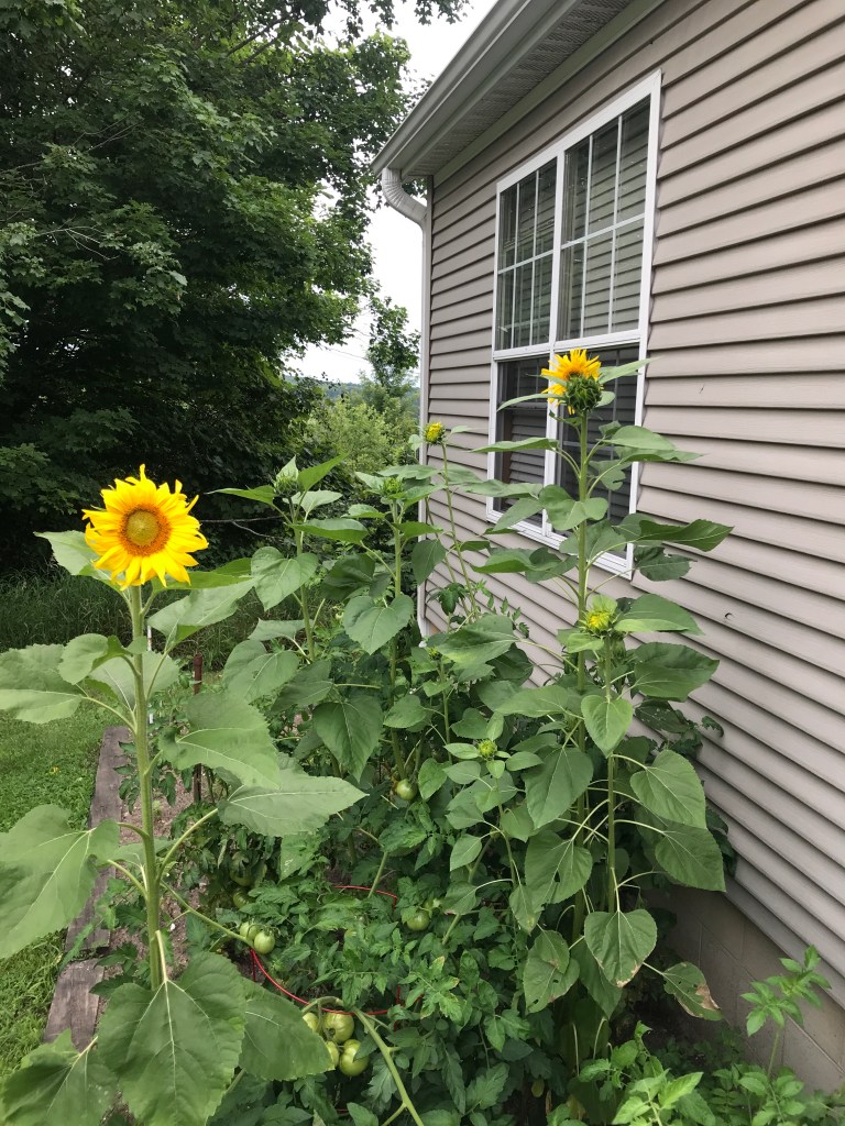We grow tomatoes next to our house every year. This year, we had a few surprises. Spinach that came up voluntarily, providing us with enough to enjoy a salad every night and it continues to provide. Also, sunflower seeds made their way into our tomatoes as well. Sweet!
