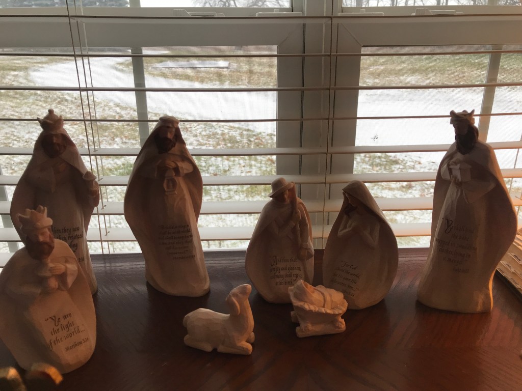 Two of Leonard’s sisters share the same mother-in-law. She was someone that I was quite close to. One year, she gave us a very small nativity figurine set. I have set it out every Christmas ever since. Unfortunately, this year, while setting up the decorations, I dropped one of the figurines and it broke. I glued it back together to remind me that even broken things can be cherished when it reminds us of those people that are special to us. Still, while visiting the resale shop, I came across these :